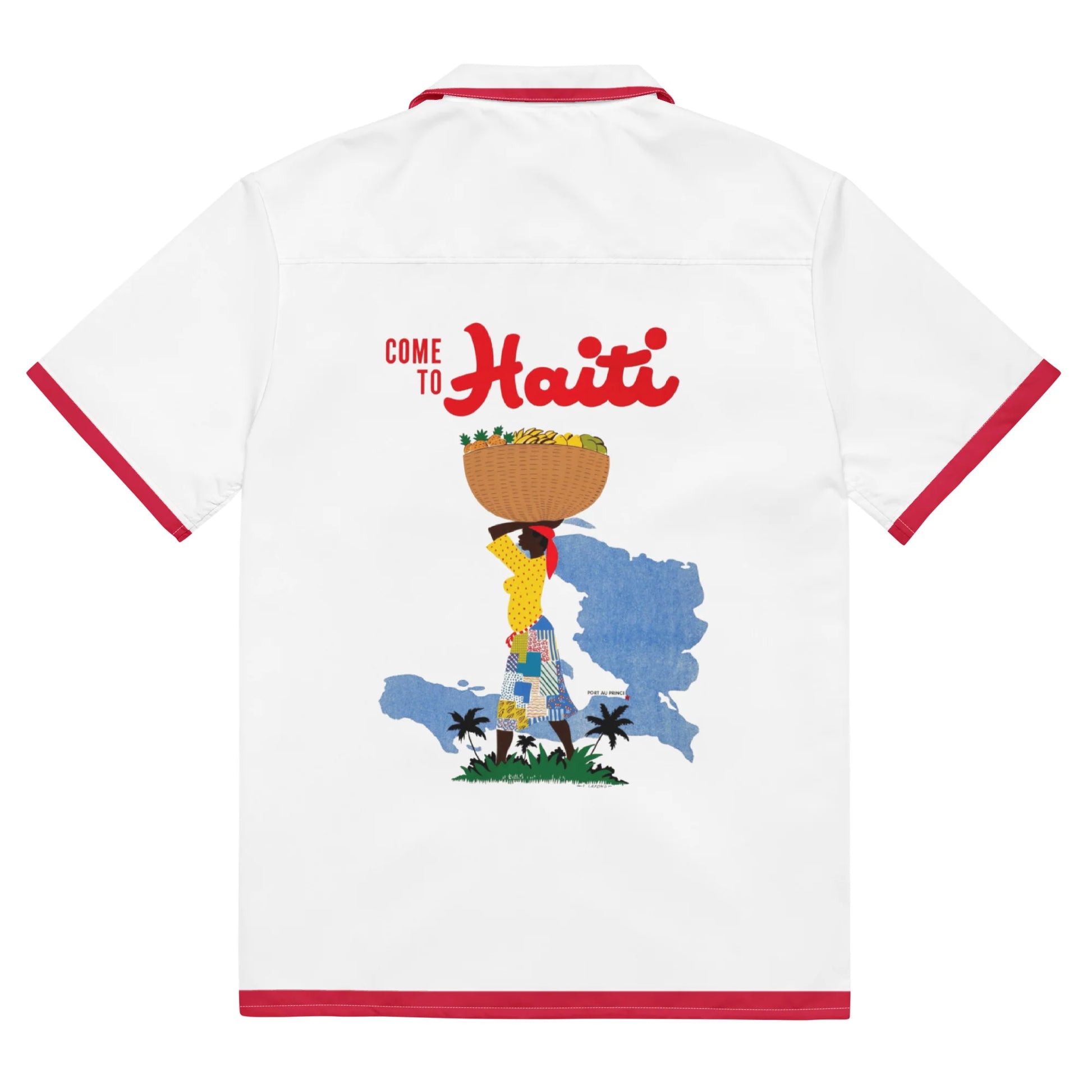 Poolside shirt inspired by mid-century Haitian tourism. Features Haiti's coat of arms during the Duvalier Dynasty (1957-1986) & artwork for Pan-American by E. LaFond (c. 1950s)